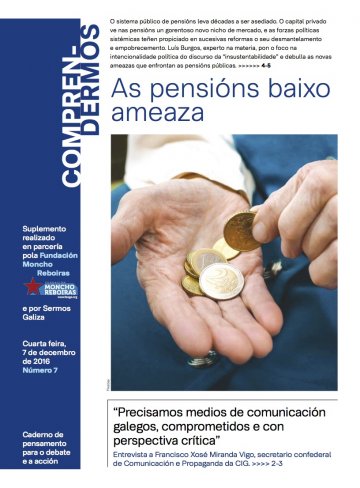 O número 7 de Comprendermos dedica o seu dossier central En Foco ás pensións baixo ameaza, co cuestionamento do sistema público de pensións, un tema de grande actualidade que preocupa e afecta ao conxunto do pobo traballador. Para iso, cedemos a palabra a Luis Burgos, experto na materia, e representante da CIG no Consello Económico e Social do Estado. O responsábel confederal de Comunicación e Propaganda da CIG, Francisco Miranda Vigo, fálanos dos esforzos realizados pola central nacionalista para renovar a súa acción no campo da comunicación, un ámbito determinante na acción sindical, e presentános o novo sitio web da CIG (www.cig.gal). O responsábel nacional de CIG-Industria, Xoán Xosé Bouza Aboi, analiza para nós o raquitismo do tecido industrial galego. Na sección conceptos, abordamos a cuestión da multipolaridade, unha nova expresión das relacións internacionais no marco dun sistema imperialista mundial en crise, con crecentes tensións entre unhas potencias que emerxen fronte outras que declinan. Finalmente, Manuel Mera analiza os máis recentes acontecementos da política internacional e avalía os indicios dunha posíbel desglobalización.