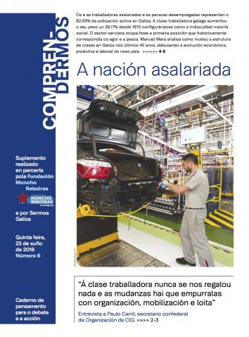No número 6, cunha temática central que sintetiza o título do caderno, a nación asalariada, abordamos as mudanzas producidas na estrutura de clases do noso país nos últimos 40 anos, da man dun traballo de Manuel Mera que debuxa a evolución económica, produtiva e laboral da Galiza. No aspecto sindical, traemos ao público unha entrevista con Paulo Carril, secretario de organización da CIG, quen aborda a situación social e laboral actual e as reivindicacións centrais do sindicalismo nacionalista e de clase para a presente etapa. Na sección conceptos, publicamos un traballo Fernando Barbeito, economista uruguaio ligado ao PIT-CNT, esclarecendo desde as categorías da economía política marxista os elementos que constitúen o salario como valor da forza de traballo. Finalmente, o historiador Uxío-Breogán Diéguez achéganos ao significado do plebiscito estatutario do 28 de xuño de 1936 co gallo do seu 60 aniversario.