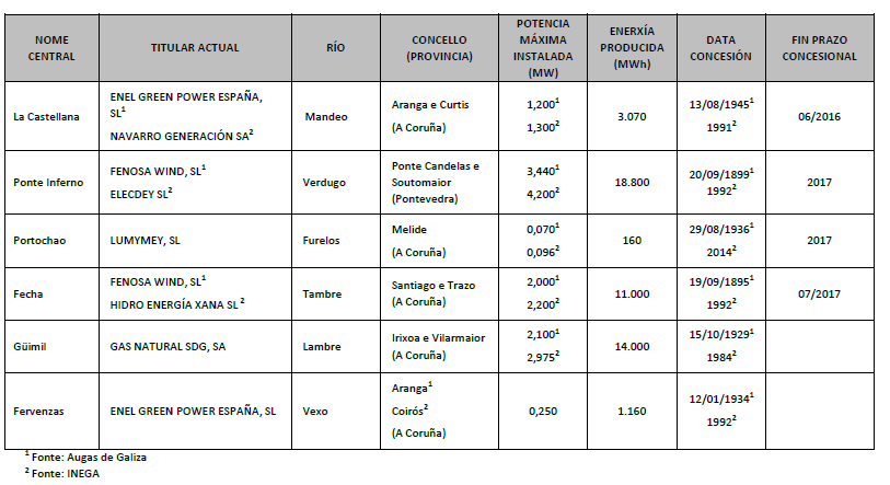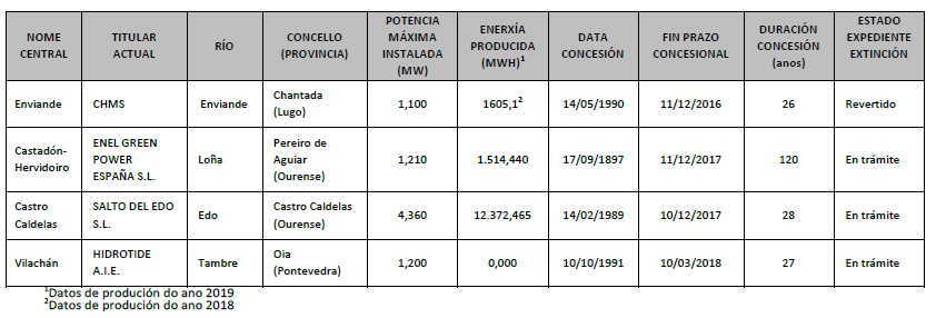 En debates no Parlamento galego, entre xuño e xullo de 2016, tanto en Pleno como en Comisión, Augas de Galiza informou ter rematado concesións ou iniciado expedientes de declaración de extinción, que estarían pendentes do informe técnico sobre da súa reversión-xestión ou demolición, das seguintes centrais: