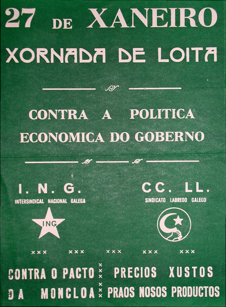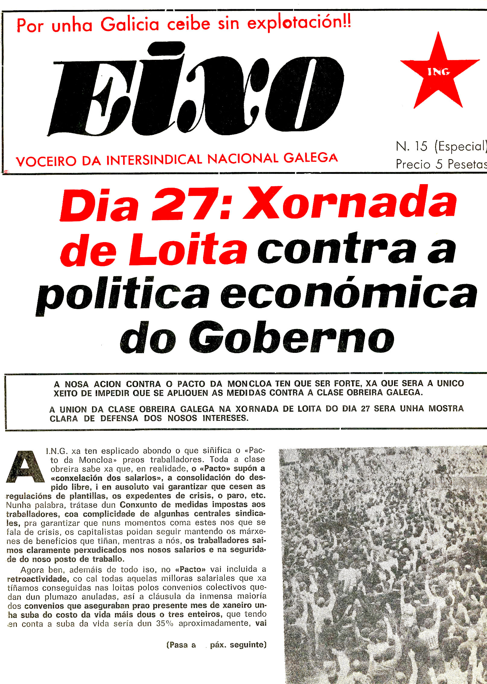 Cómpre salientarmos, pola súa importancia histórica, a xornada de loita do 27 de xaneiro de 1978 contra o Pacto da Moncloa. A iniciativa xurdiu do SOG (ING) e tivo unha importante repercusión entre os traballadores/as, tamén nos medios, e ademais daría un importante pulo ao nacionalismo galego. Foi unha convocatoria conxunta da ING e das CC.LL, e contou co apoio activo de ERGA (Estudantes Revolucionarios Galegos) e da AN-PG (Asemblea Nacional-Popular Galega). Para alén de que os sectores convocados á folga pararan ou non masivamente (que non foi o caso), o certo é que foron xornadas nas que se tensou a sociedade, moi especialmente no eido laboral, polo que foron un éxito. Xerouse debate, polémica, e isto fixo do nacionalismo unha referencia moito maior que a que lle correspondía daquela polo seu peso numérico, mesmo superando a forzas cunha longa historia de loita contra a ditadura, como o PCE e CCOO, e que ademais tiñan moitísima máis militancia organizada.