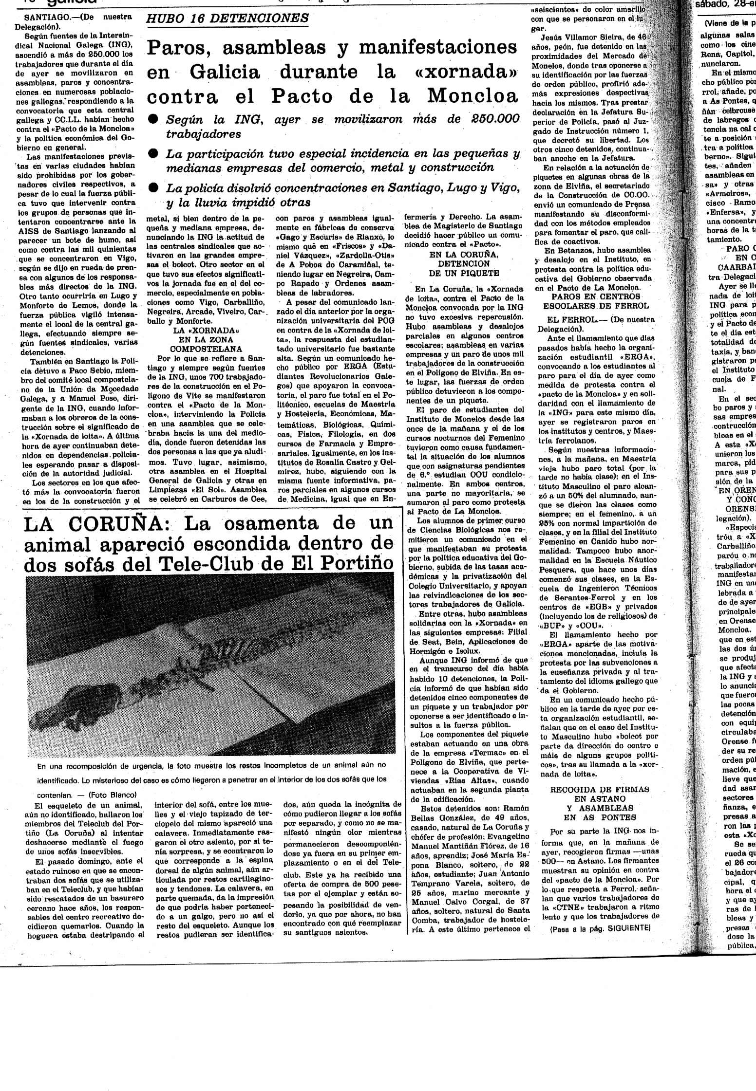 O semanario galeguista engadía na información: “cando estaban a punto de cumprirse 70 horas dende a detención, un membro dos piquetes informativos de Monforte seguía no Depósito Municipal, tamén foron detidos outros tres traballadores que participaron da xornada de loita do 27. Estiveron no calabozo cun orzamento de 72 pesetas para comer todo o día.”. E por último salientaba “Que central sindical, con todo en contra, une a un país de norte a sur a través de 50 localidades e de centos de fábricas e lugares de estudo?... desta primeira mobilización nacional todos nós levamos moito aprendido”.