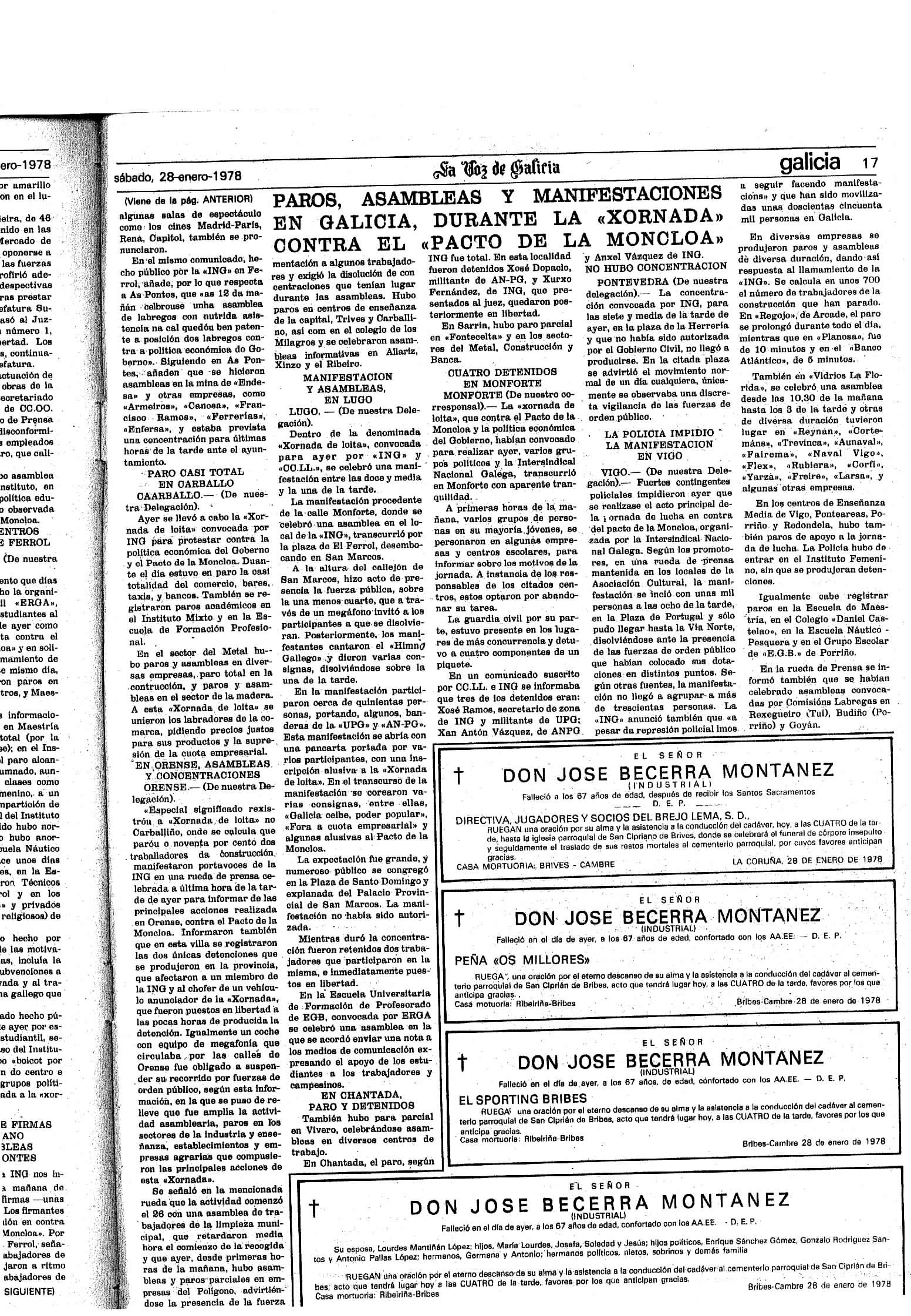 “Allariz, Arcade, A Coruña, As Pontes, Arzúa, A Póboa, Carballo, Cangas, Cee, Cambados, O Carballiño, Chantada, Lugo, Monforte, Moaña, Muimenta, Mugardos, Negreira, Noia, Ferrol, Ourense, Ordes, Pontecaldelas, O Porriño, Pontevedra, Portomarín, Quiroga, Rianxo, Ribeira, Barreiros, Sarria, Compostela, Vilalba, Viveiro, Vigo, Xinzo de Limia, parroquias de Terrachá, Bergantiños, O Ribeiro, e a bisbarra de Pontevedra… Nestas vilas e cidades galegas expresáronse as diferentes maneiras de participación, por parte de clases e sectores sociais diversos contra o Pacto da Moncloa, que os sindicatos nacionalistas Intersindical Nacional Galega (ING), e as Comisións Labregas, CCLL (hoxe, Sindicato Labrego Galego), decidiran para o venres 27 de xaneiro.”