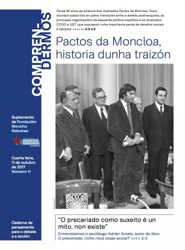 Neste novo número de Comprendermos, publicamos un dossier central sobre os Pactos da Moncloa, co gallo de se cumpriren este 25 de outubro, 40 anos da súa sinatura. Suso Seixo, presidente da Fundación Moncho Reboiras, debulla nestas páxinas o significado dos acordos asinados en 1977 por UCD, AP, PSOE, PCE, PSP, CiU e PNV, e as nefastas consecuencias que tiveron para o movemento obreiro e o conxunto do pobo traballador.
